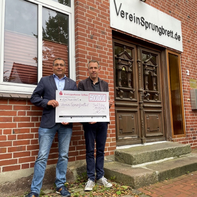 Interessierte können sich auf der Internetseite www.vereinsprungbrett.de informieren und den eigenfinanzierten Verein durch Spenden oder eine Mitgliedschaft unterstützen. Wir bedanken uns bei Herrn Sauer für die sehr informative Vorstellung des Verein Sprungbrett e.V. sowie beim gesamten Team für das tolle und sehr wichtige Engagement. Für die Zukunft wünschen wir alles Gute und viel Erfolg! Das Foto zeigt unseren Geschäftsführer Thorsten Schröder und Thorsten Sauer vom Verein Sprungbrett e. v. bei der Scheckübergabe.